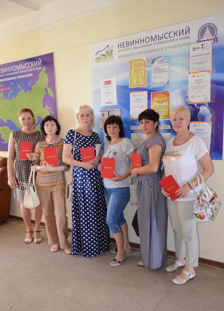 30 июня в Невинномысском институте экономики, управления и права состоялось торжественное вручение дипломов о профессиональной переподготовке. В институте прошли обучение слушатели по трем дополнительным профессиональным программам «Педагог профессионального образования», «Управление государственными и муниципальными заказами», «Управление персоналом».
