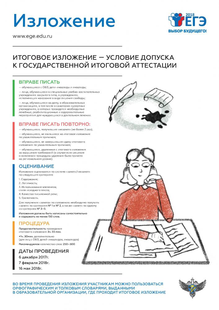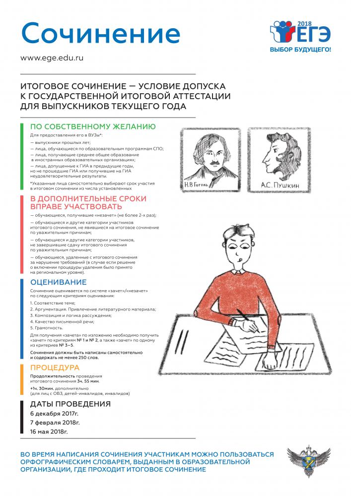 19.12.2017Федеральная служба по надзору в сфере образования и науки подготовила обновленную серию плакатов, посвященных процедурам сдачи единого государственного экзамена, итогового сочинения и изложения.