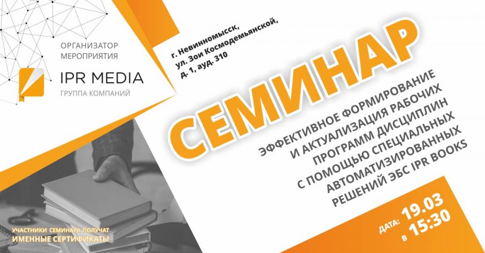 19 марта 2019 года в Невинномысском институте экономики, управления и права состоялся семинар «Эффективное формирование и актуализация рабочих программ дисциплин с помощью специальных автоматизированных решений ЭБС IPR books».