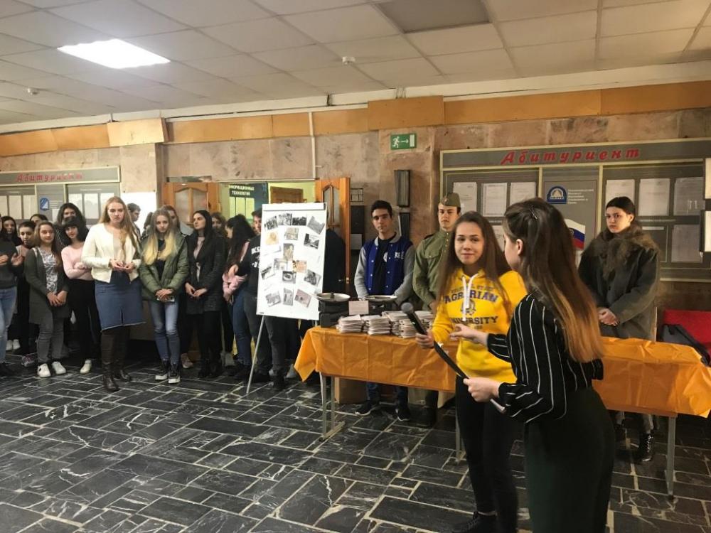 Активисты регионального отделения общероссийского общественного молодежного движения «Ассоциация студентов и студенческих объединений России» совместно со Ставропольской краевой общественной организацией «Российский союз молодёжи» в Ставропольском крае и Федеральным государственным образовательным учреждением высшего образования «Ставропольский государственный аграрный университет» 4-го апреля посетили Невинномысский институт экономики, управления и права и Невинномысский экономико-правовой техникум для проведения Ставропольской краевой патриотической акции «Блокадный хлеб».