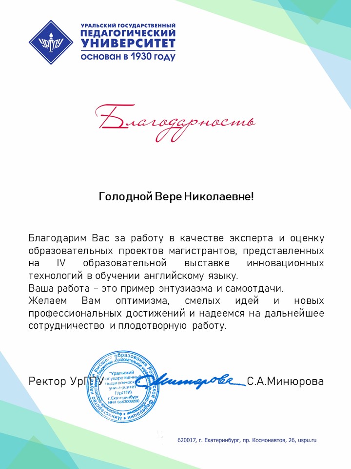 18 июня 2021 года доцент кафедры Психологии и гуманитарных дисциплин кандидат филологических наук Голодная Вера Николаевна приняла участие в работе IV образовательной выставки инновационных технологий в обучении английскому языку в качестве члена жюри. Мероприятие проходило в режиме онлайн на базе Уральского государственного педагогического университета (г. Екатеринбург).