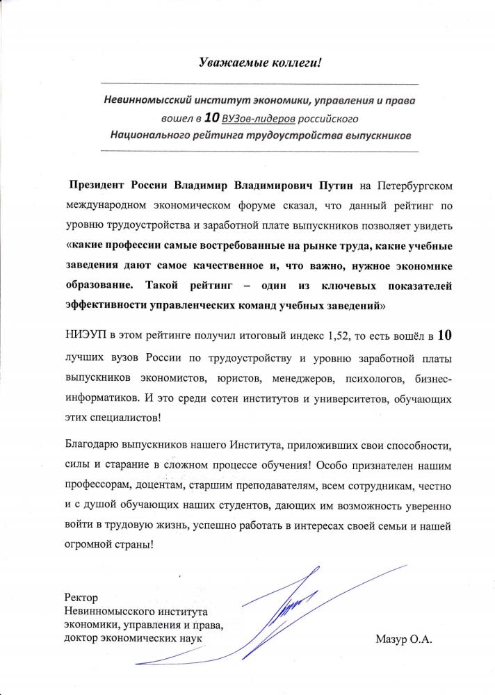 Невинномысский институт экономики, управления и права вошел в 10 ВУЗов-лидеров российского Национального рейтинга трудоустройства выпускников
